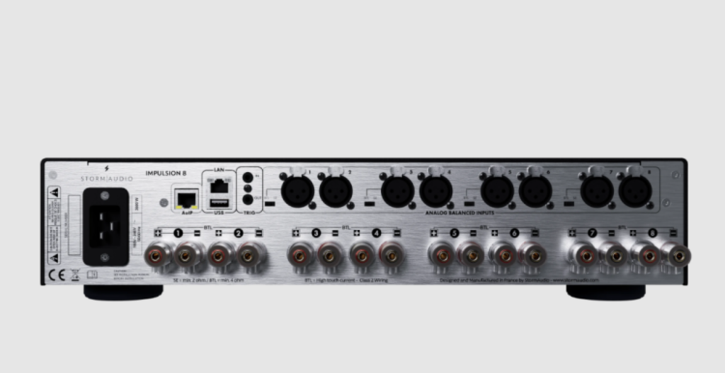The Impulsion 8 aims to integrate tightly with the StormAudio ecosystem: for example, when paired with a StormAudio processor, the amplifier is automatically detected and configured to reduce setup time.